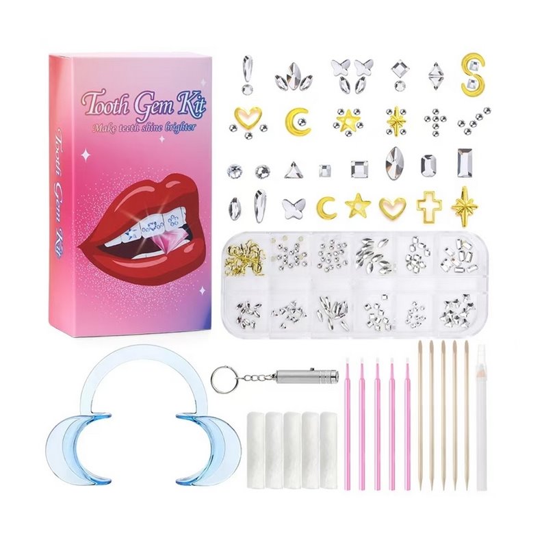 Le kit comprend une sélection variée de strass élégants et brillants, allant des formes classiques comme les ronds et les étoiles à des designs plus uniques tels que des papillons et des cœurs. Ces cristaux sont fabriqués à partir de matériaux non toxiques et spécialement conçus pour respecter l’émail des dents.