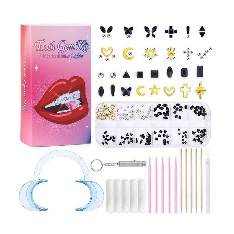 Le kit comprend une sélection variée de strass élégants et brillants, allant des formes classiques comme les ronds et les étoiles à des designs plus uniques tels que des papillons et des cœurs. Ces cristaux sont fabriqués à partir de matériaux non toxiques et spécialement conçus pour respecter l’émail des dents.