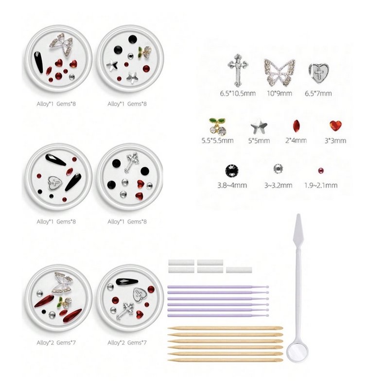 Un assortiment de strass couleur élégants et variés : Des designs uniques, les strass inclus sont parfaitement conçus pour offrir un éclat durable et chic. Des cotons salivaires, des bâtons en bois, des applicateurs, une spatule avec miroir.
