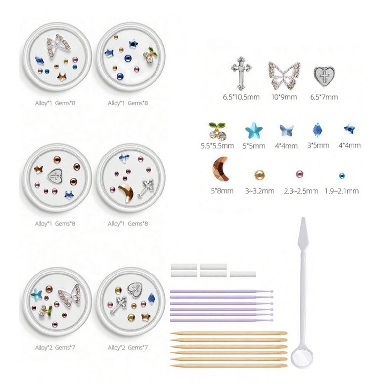Un assortiment de strass couleur élégants et variés : Des designs uniques, les strass inclus sont parfaitement conçus pour offrir un éclat durable et chic. Des cotons salivaires, des bâtons en bois, des applicateurs, une spatule avec miroir.
