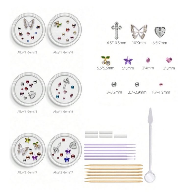 Un assortiment de strass couleur élégants et variés : Des designs uniques, les strass inclus sont parfaitement conçus pour offrir un éclat durable et chic. Des cotons salivaires, des bâtons en bois, des applicateurs, une spatule avec miroir.