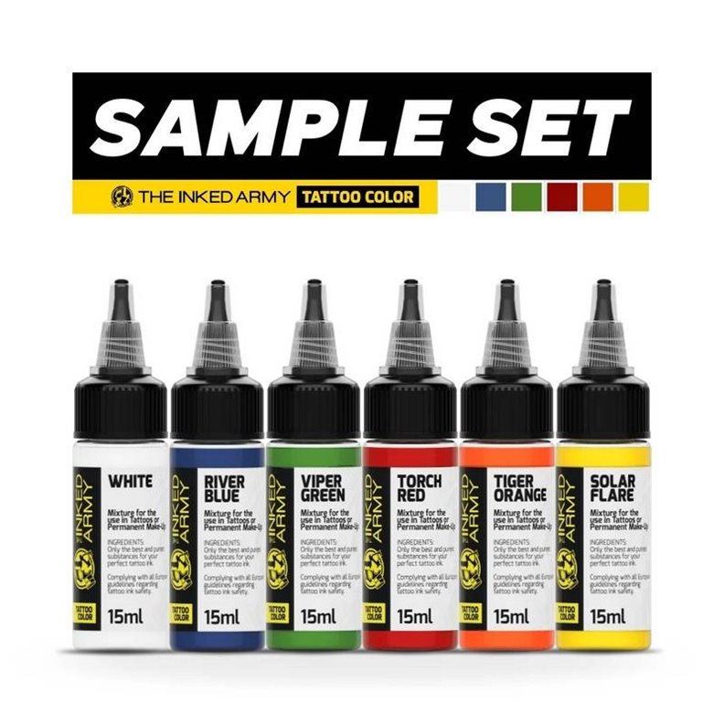 Le Sample Set The Inked Army Tattoo Colors est l’introduction idéale pour découvrir l’essence et la performance de la Color Series. Cette sélection soigneusement composée de six teintes primaires emblématiques permet aux tatoueurs de tester en conditions réelles la fluidité, la saturation intense et la régularité du rendu après cicatrisation propres aux encres The Inked Army Tattoo Colors. Pensé pour l’exploration, l’essai et l’optimisation de votre palette, ce kit met en avant la polyvalence et l’équilibre des couleurs, quel que soit le style pratiqué.