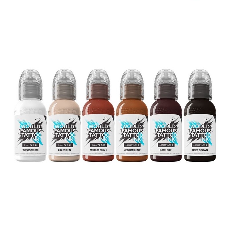 C'est un kit de 6 encres de tatouage opaques dans des tons de peau essentiels, du blanc pur au brun foncé, conçu pour créer des tatouages de portraits parfaits.