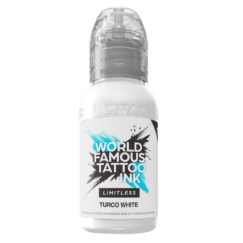 L'encre WORLD FAMOUS Limitless Turco White propose des pigments de très haute qualité ainsi qu'une pénétration en peau inégalé, avec une cicatrisation au poil.