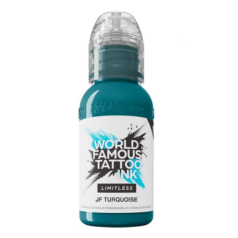 L'encre WORLD FAMOUS Limitless JF Turquoise propose des pigments de très haute qualité ainsi qu'une pénétration en peau inégalé, avec une cicatrisation au poil.