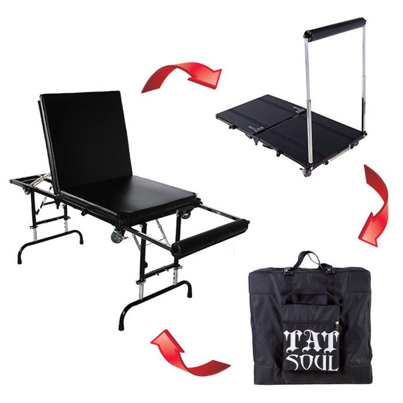 La table de tatouage TatSoul X se distingue par son design exceptionnel, offrant une combinaison inégalée d'efficacité et de portabilité. Son pliage ingénieux la rend extrêmement compacte et facilement transportable, se glissant parfaitement dans un sac à dos en toile robuste spécialement conçu.
