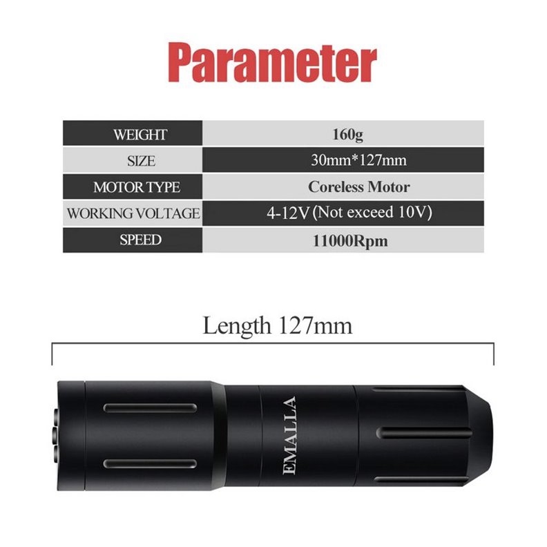 La machine EMALLA AVON Wireless Pen est équipé d'un moteur de haute qualité, fort et puissant avec ces 11000 tr/min. Nous vous suggérons une tension de fonctionnement entre 4 et 12 volts.