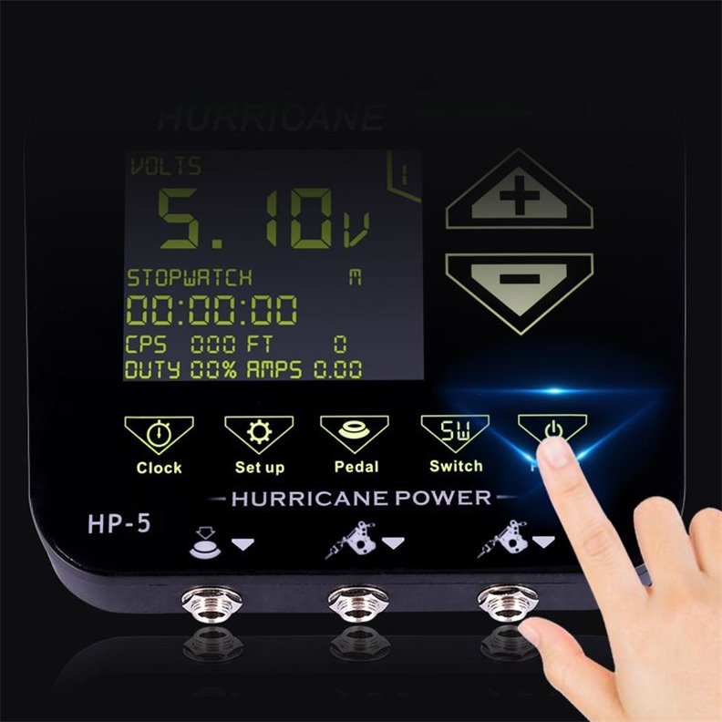 L'alimentation de tatouage numérique Hurricane HP-5 fournit une puissance constante avec une tension réglable jusqu'à 18 volts.